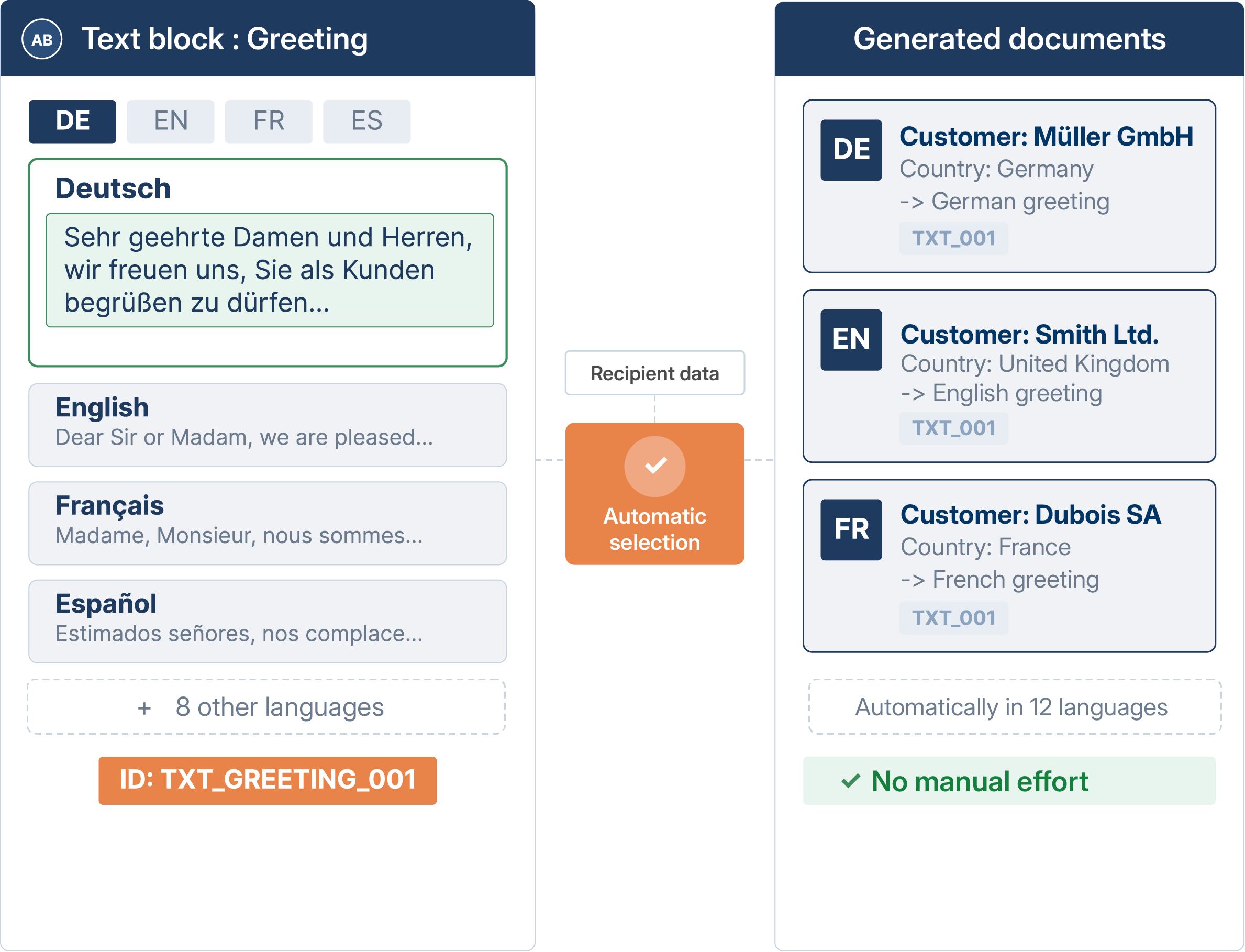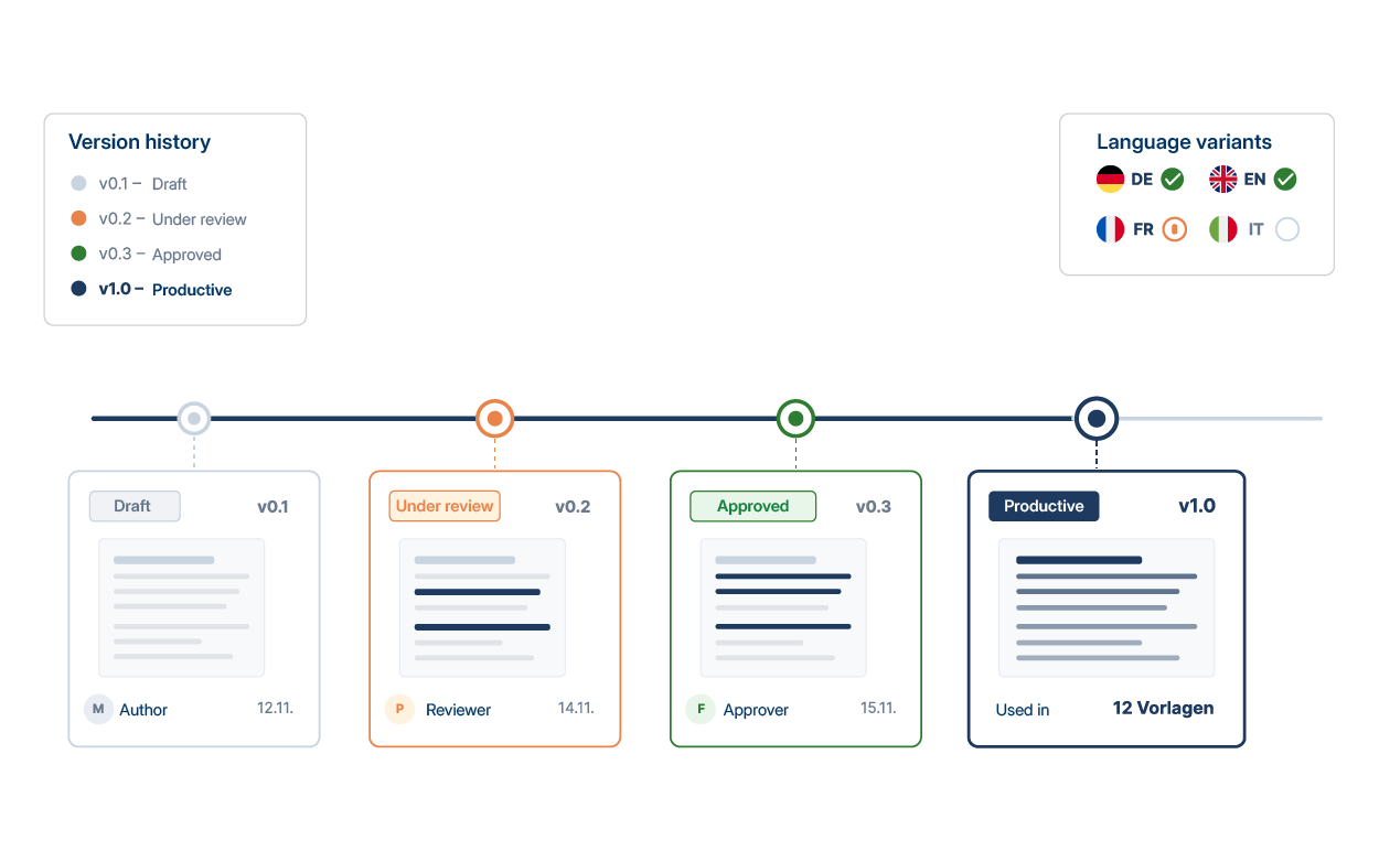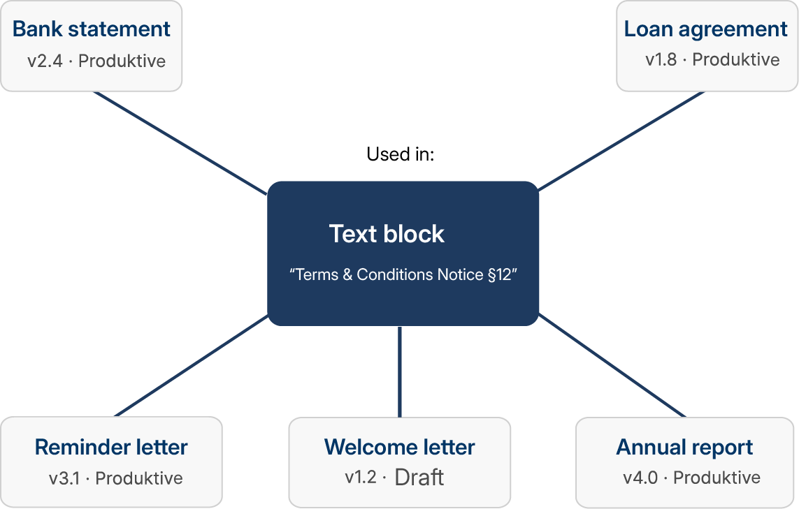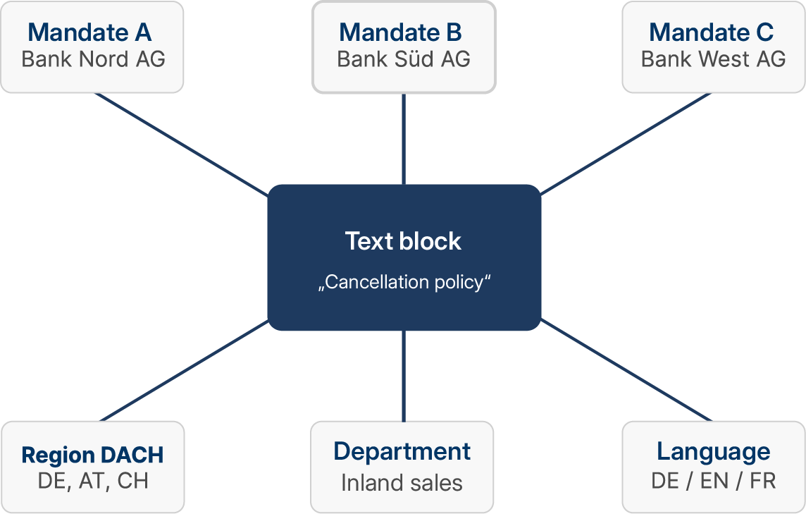 In addition to language variants, you also manage variants for different sub-clients, departments or regions. When creating the document, the system automatically selects the appropriate version, without additional logic in the templates.