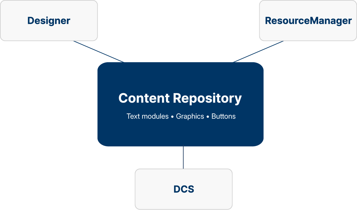 The ContentRepository is the central hub for all reusable content in your document templates. Text modules, graphics, and buttons are maintained once and are available for all templates company-wide, in any number of languages and variants.