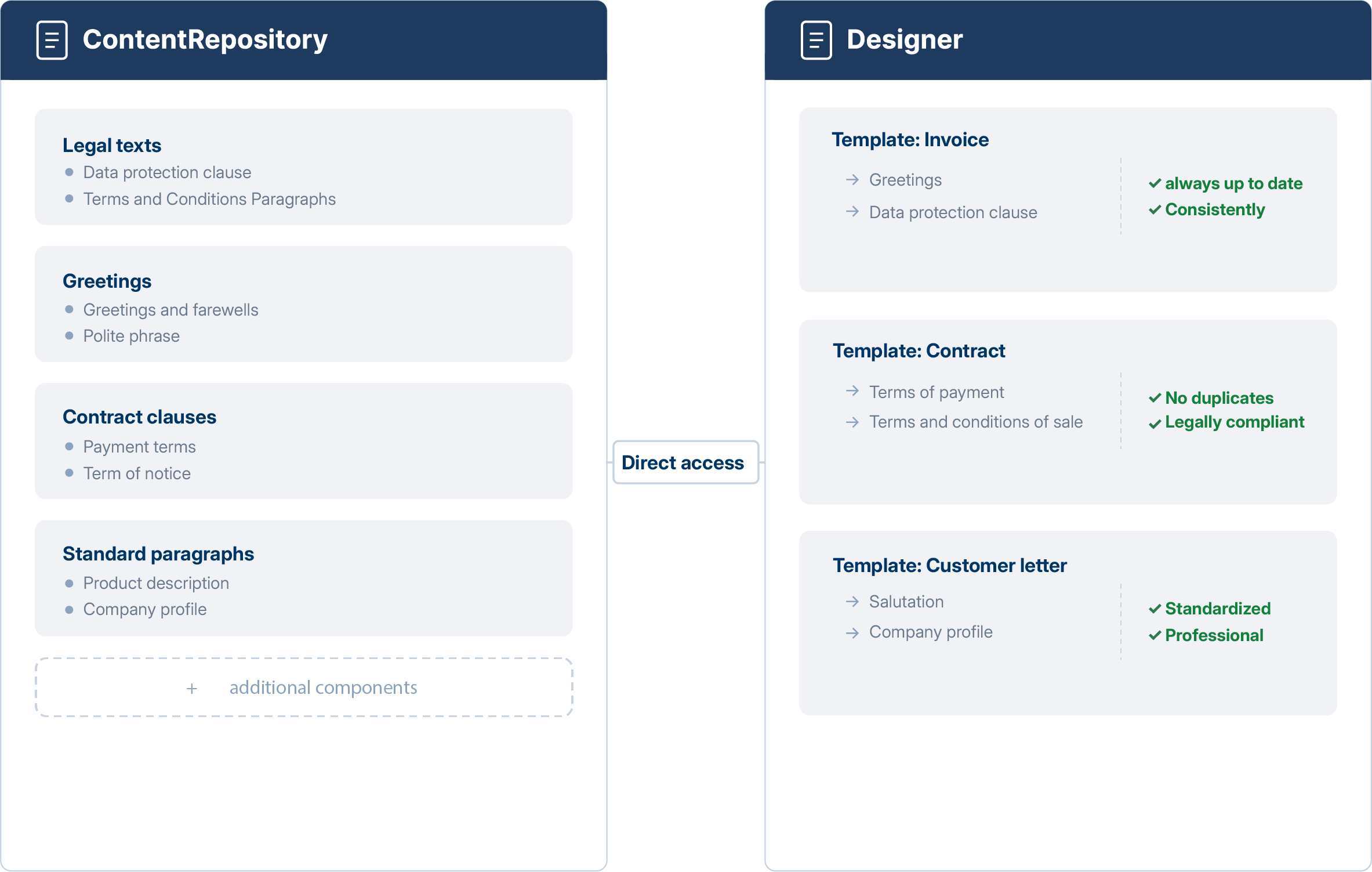 All content is stored in one place. You create clauses, legal texts, greetings and standard paragraphs once in the repository. The INVARISDesigner accesses these components directly when creating templates. This prevents duplicates and inconsistent wordings.