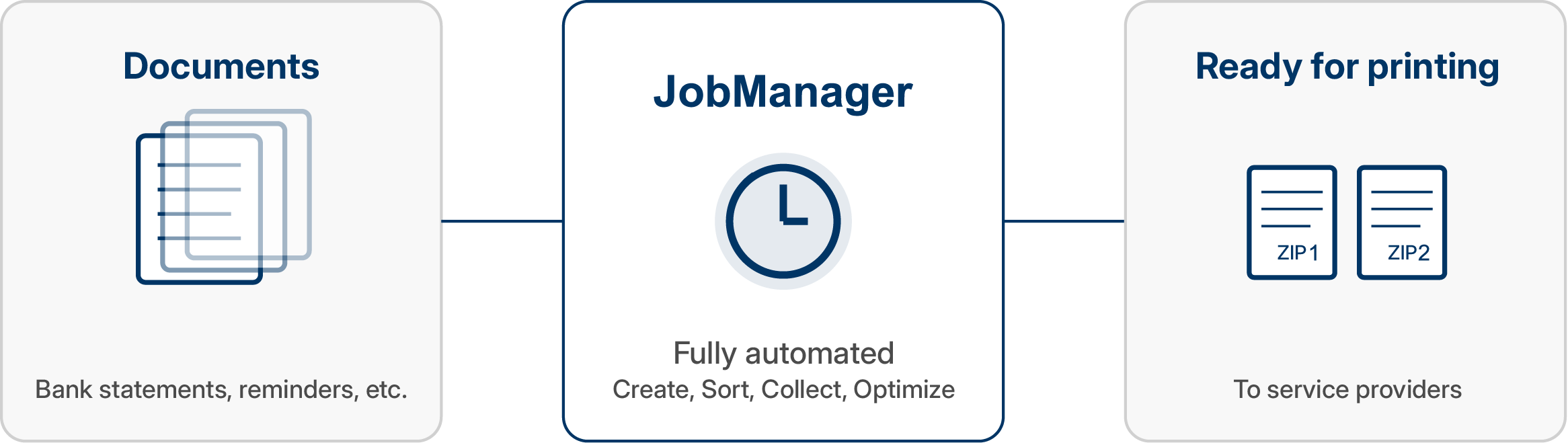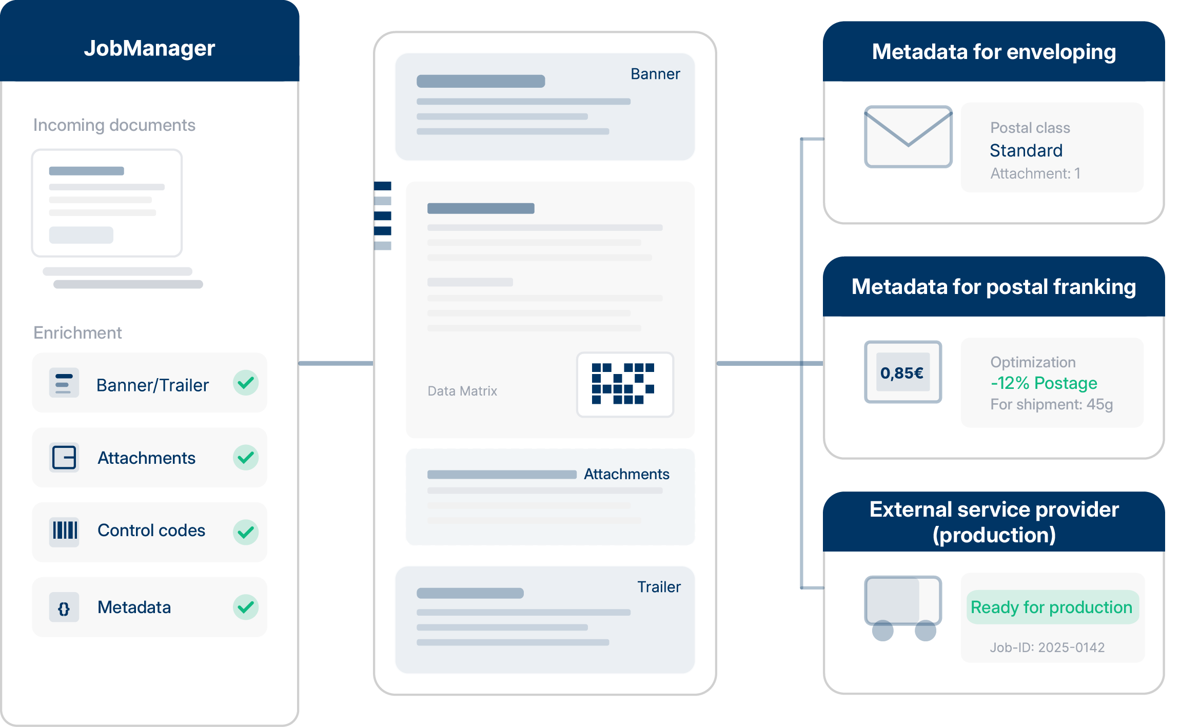 The JobManager prepares print data for further processing. Control elements and metadata for enveloping and franking are added and handed over to external service providers who handle the physical processing.