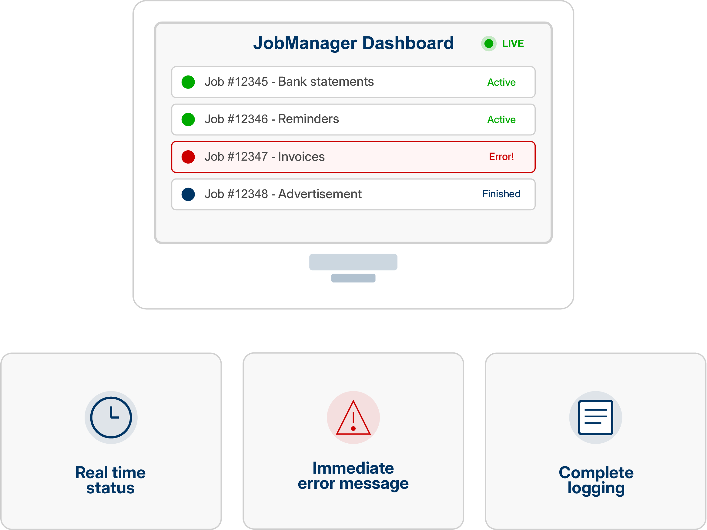 All document processes are monitored centrally. You can see the current status of every document and job, and identify early on whether processes have been completed or require attention. Status feedback from print preparation, external enveloping, and portals is captured and displayed in a central view.
