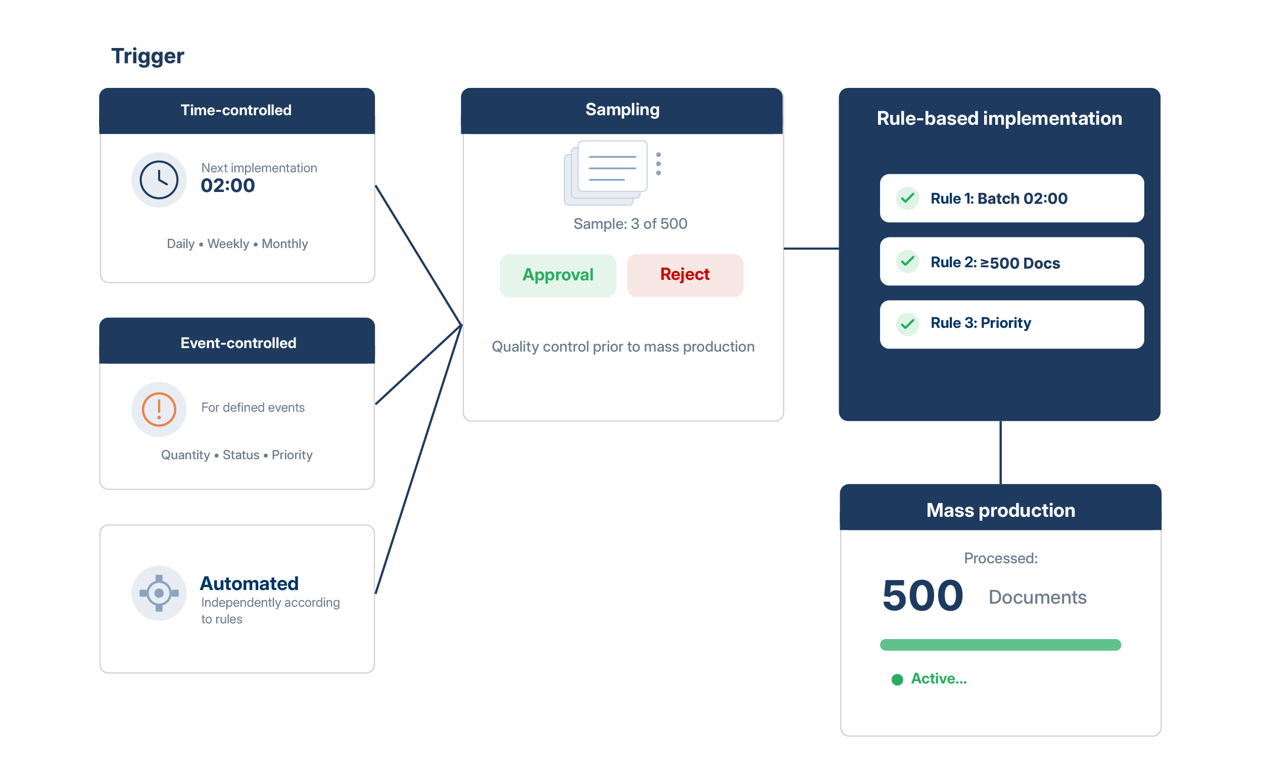 Output jobs are triggered on a time-scheduled basis, such as during nightly batch runs, or on an event-driven basis by external systems, e.g., via a REST interface. Sample-based approvals enable quality control before mass production. Processing then continues automatically according to defined rules.
