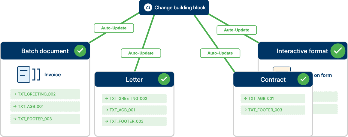 Rechtliche Anpassungen pflegen Sie einmal zentral. Alle Dokumente, die den Baustein nutzen, sind sofort aktuell, auch bei Millionen von Briefen pro Jahr.